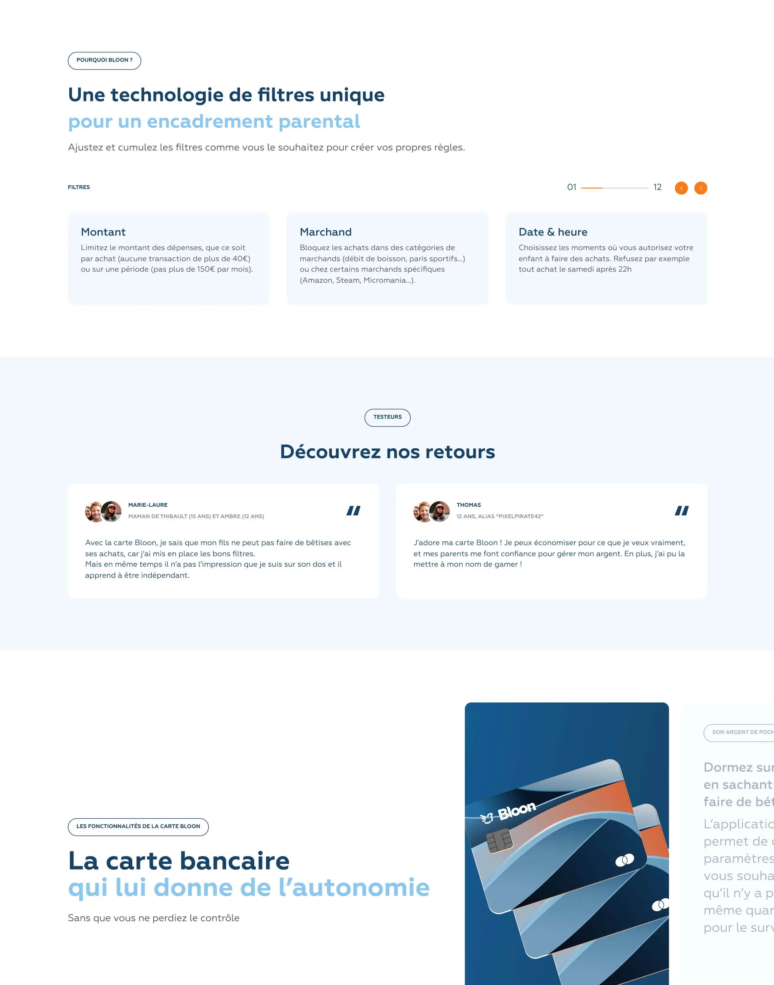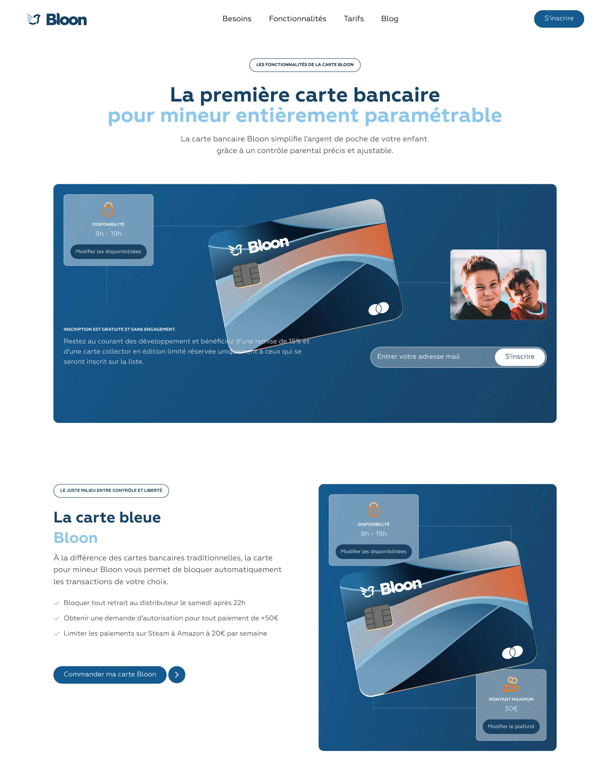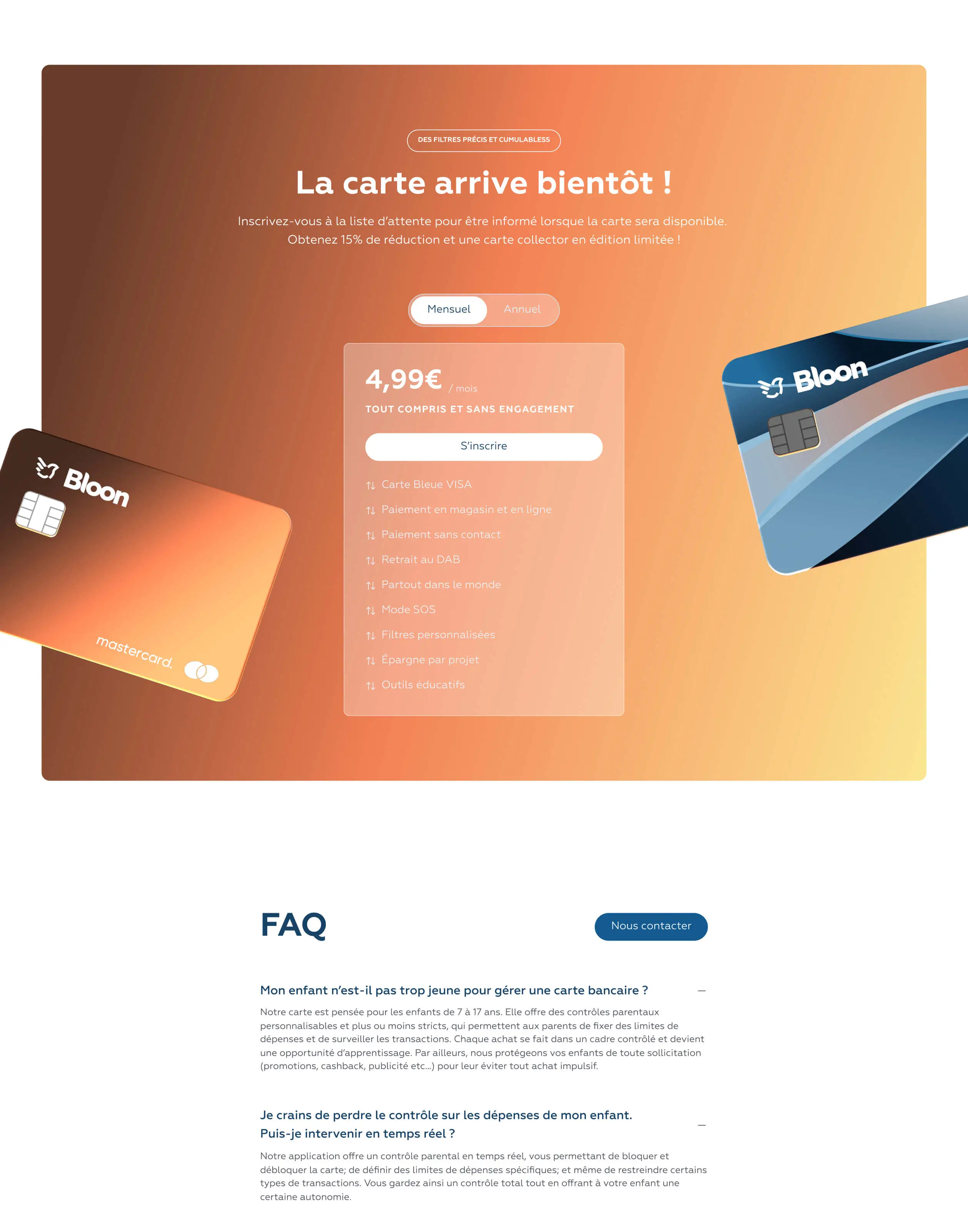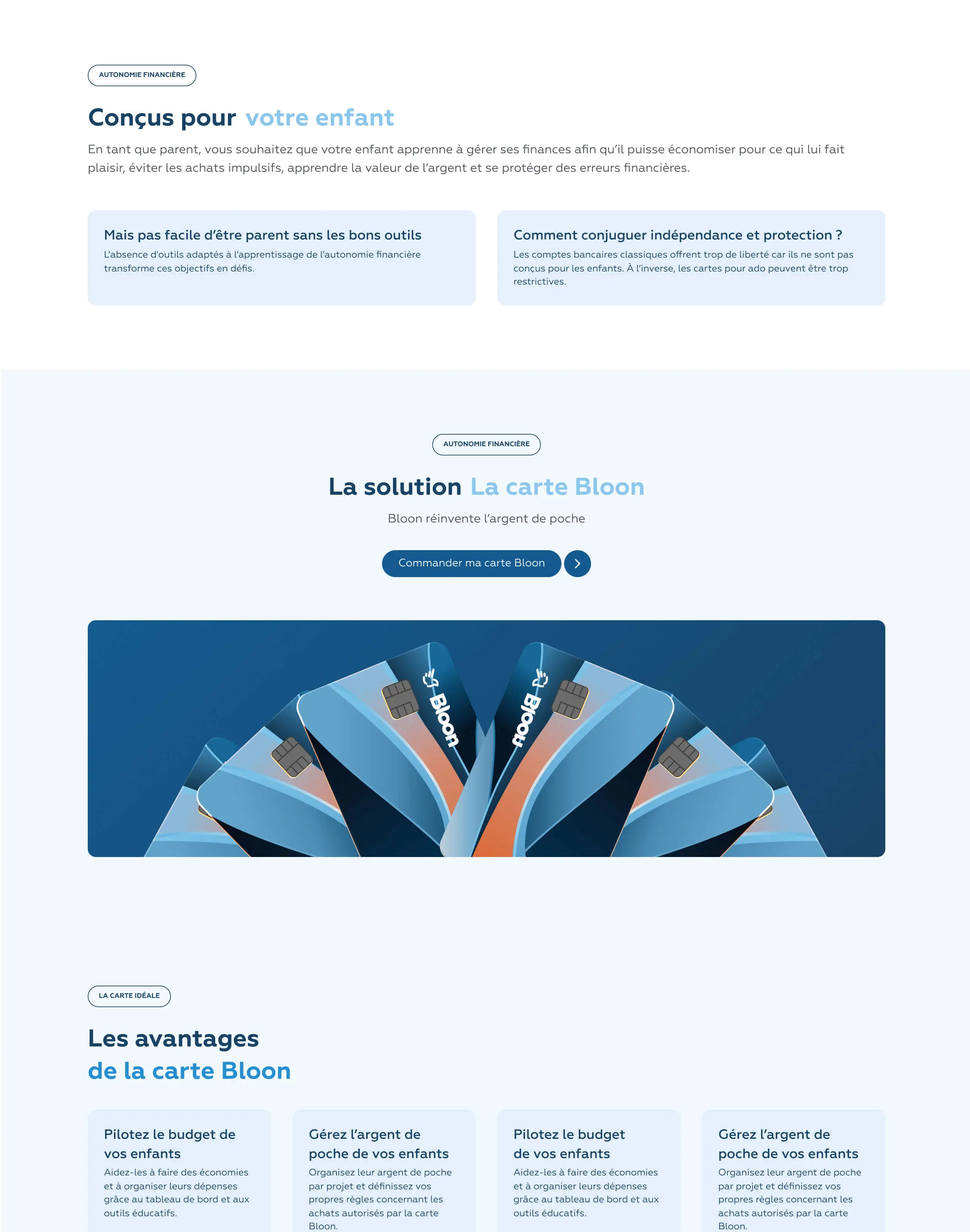 Refonte du site de Bloon, la première carte bancaire pour mineur entièrement paramétrable. Web design et assets 3D pour une double audience parents et enfants.