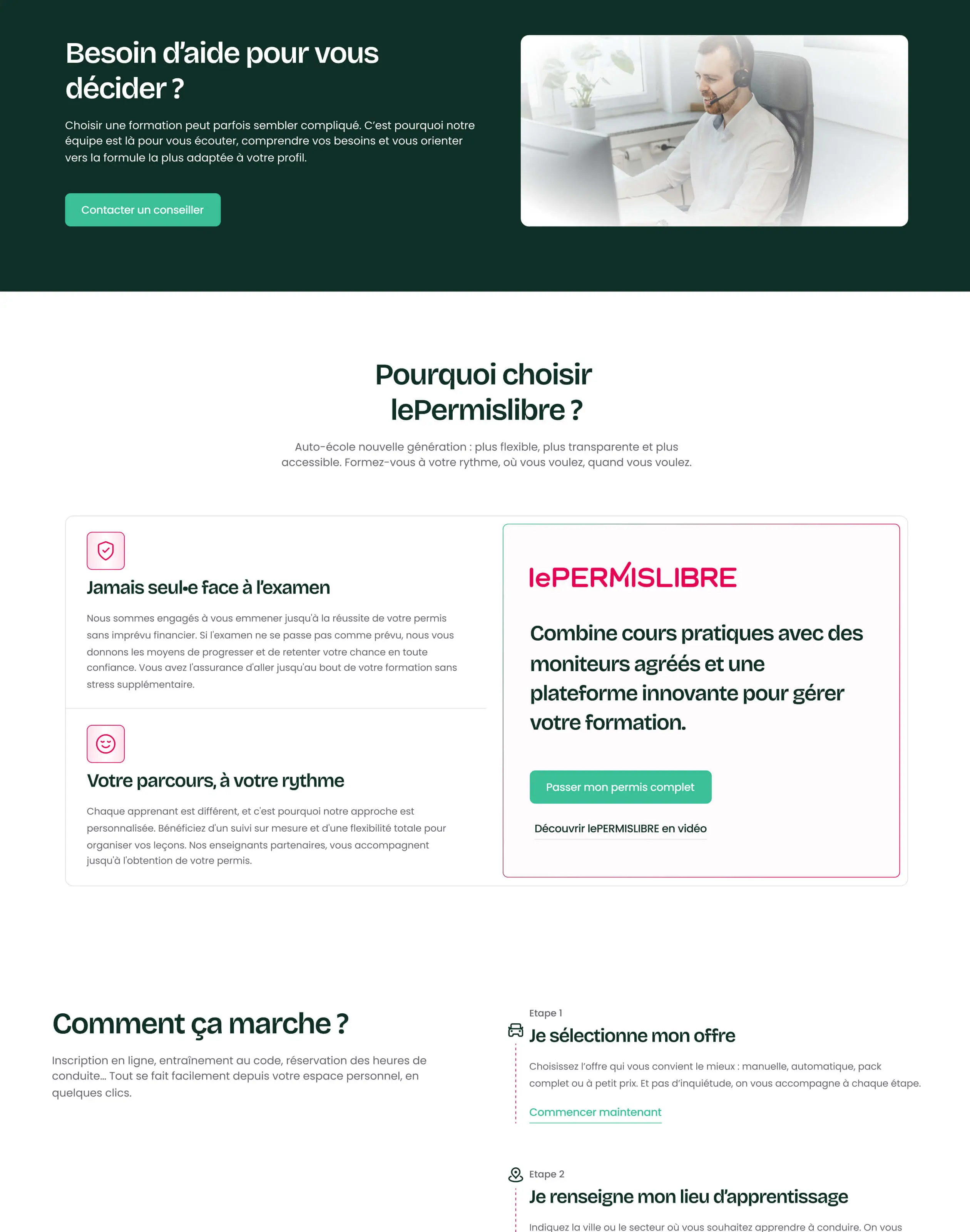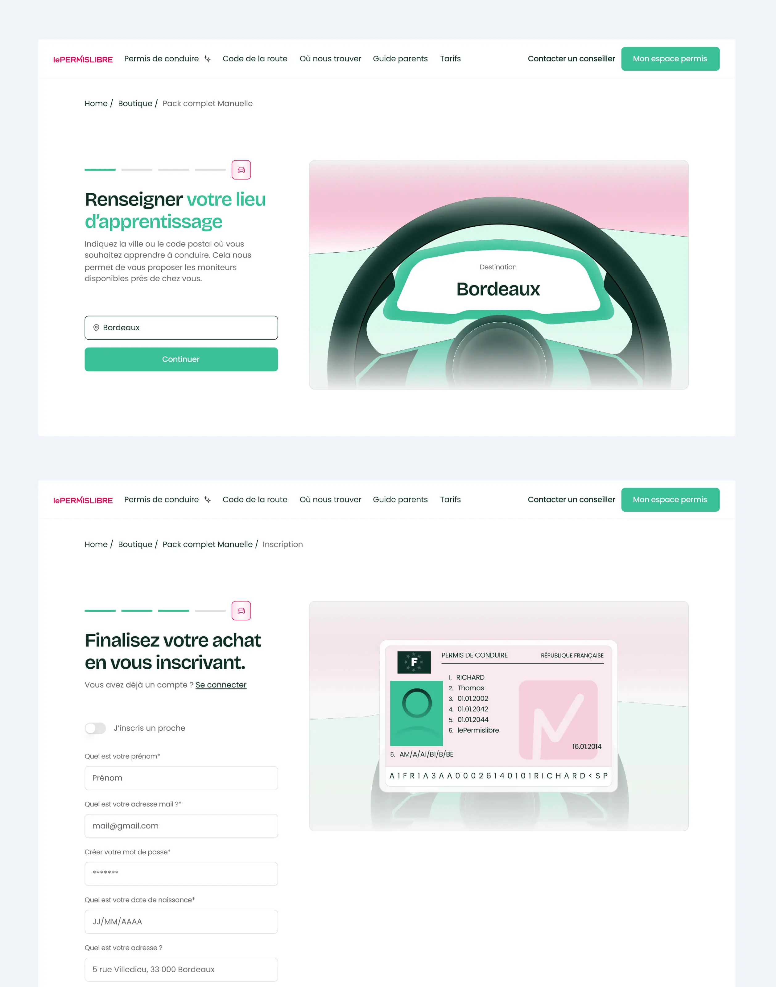 Optimisation du parcours d'achat et de l'onboarding de LePERMISLIBRE, auto-école 100% en ligne. UX/UI, assets et refonte de pages pour améliorer la conversion.