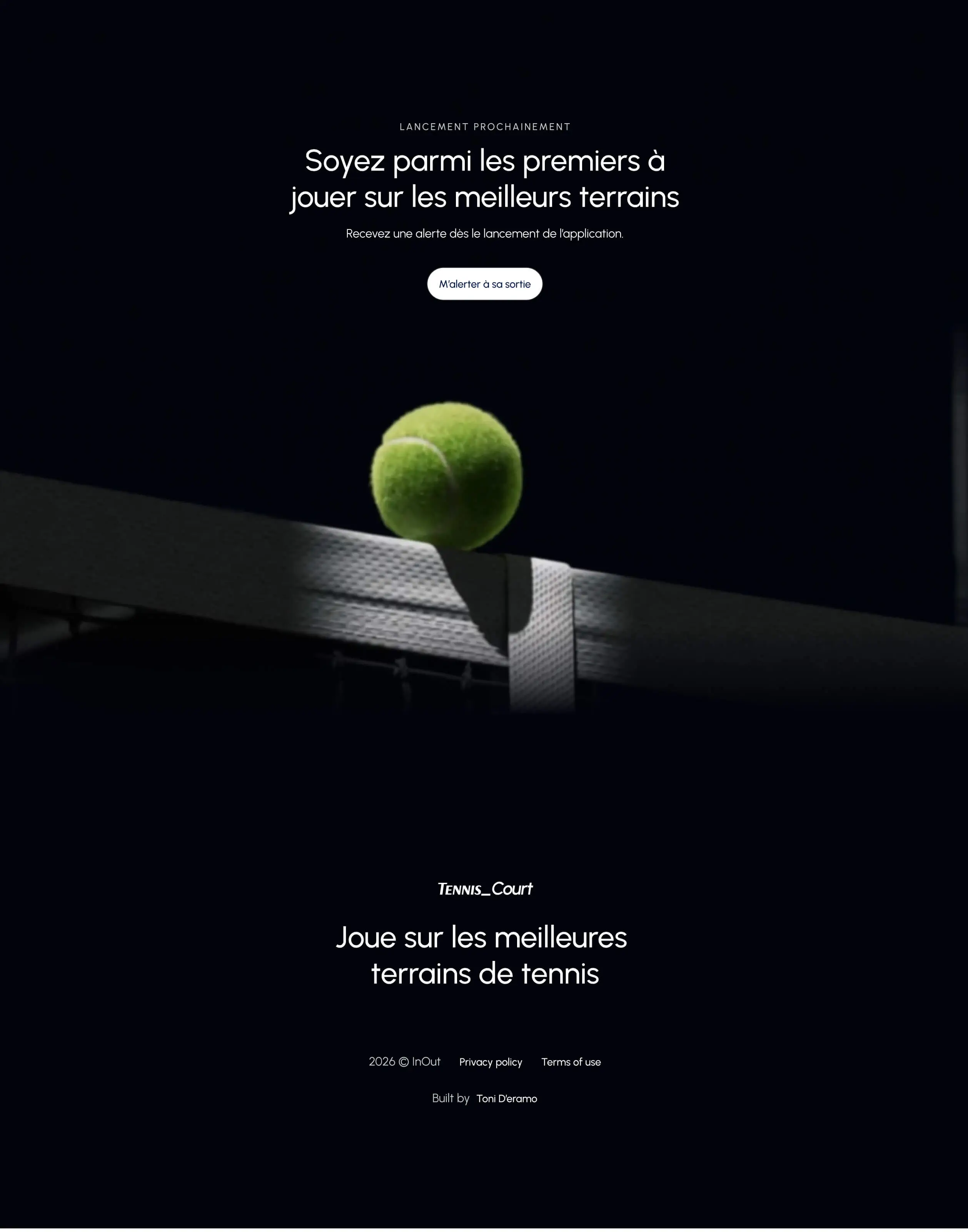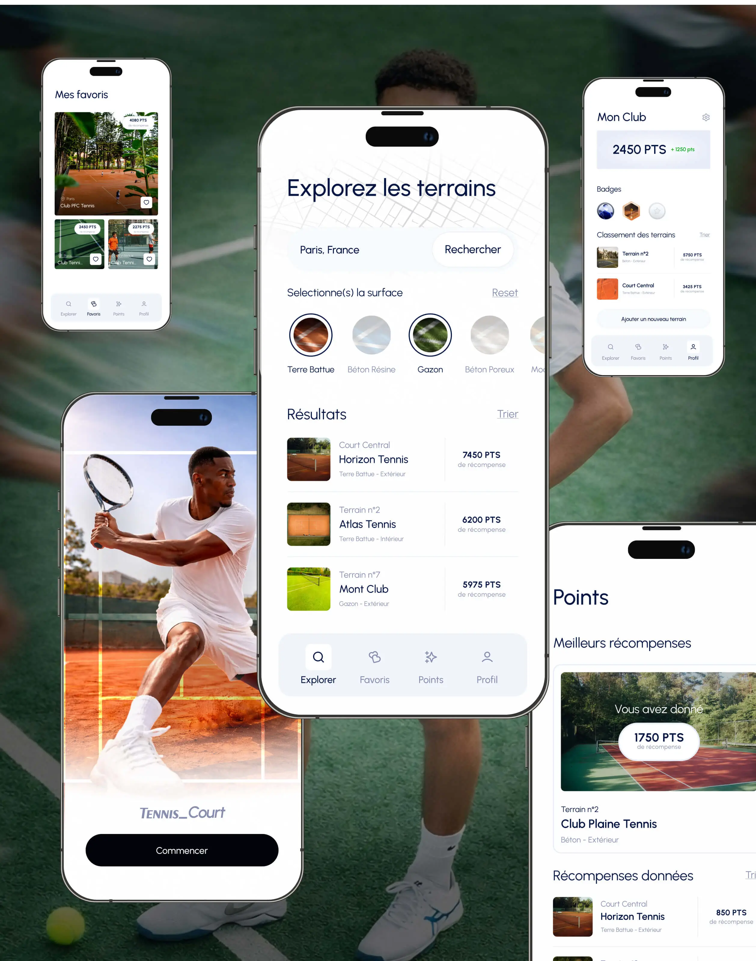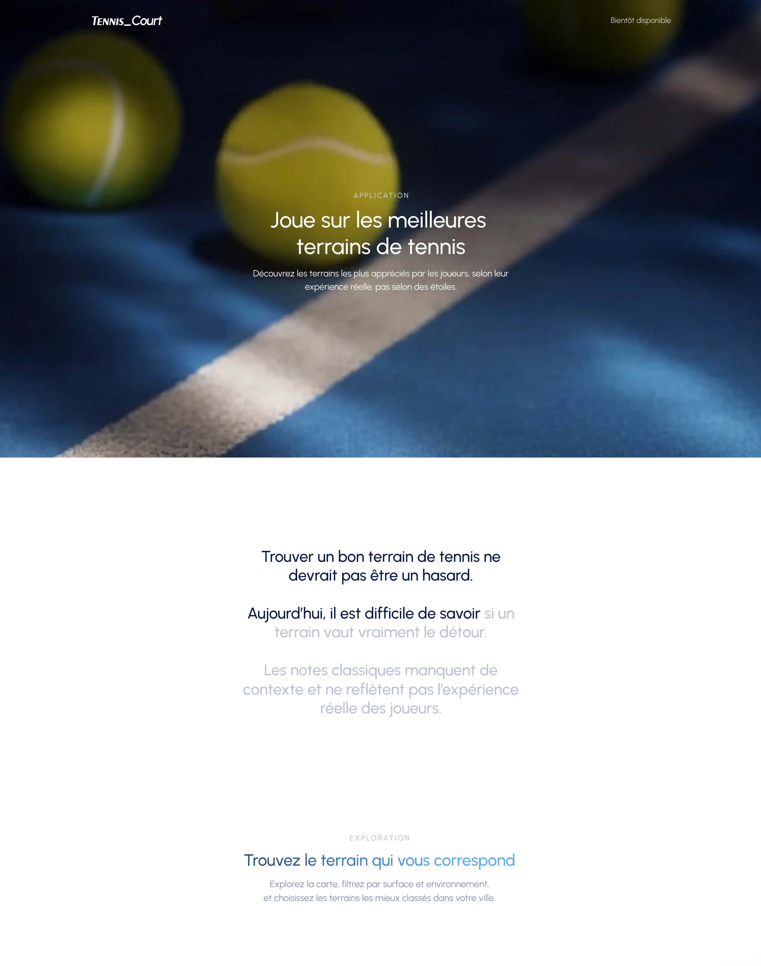 Tennis Court est un projet personnel conçu en 5 jours pour les Framer Awards. L'objectif : permettre aux joueurs de découvrir et choisir des terrains de tennis selon l'expérience réelle, qualité du terrain, surface et localisation. Mon rôle a été de concevoir le concept, designer les écrans clés et développer l'ensemble sur Framer, en autonomie complète et à partir de zéro.