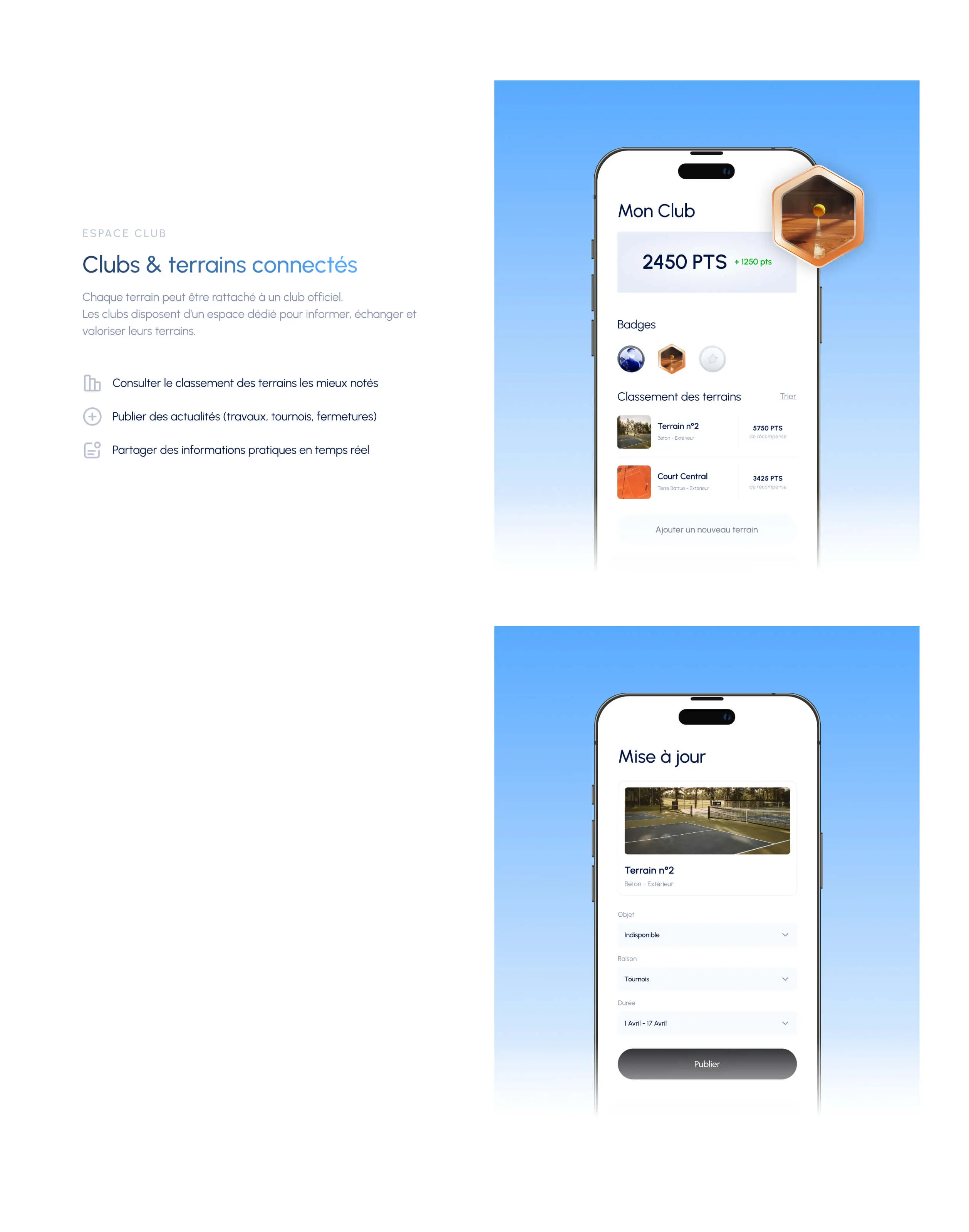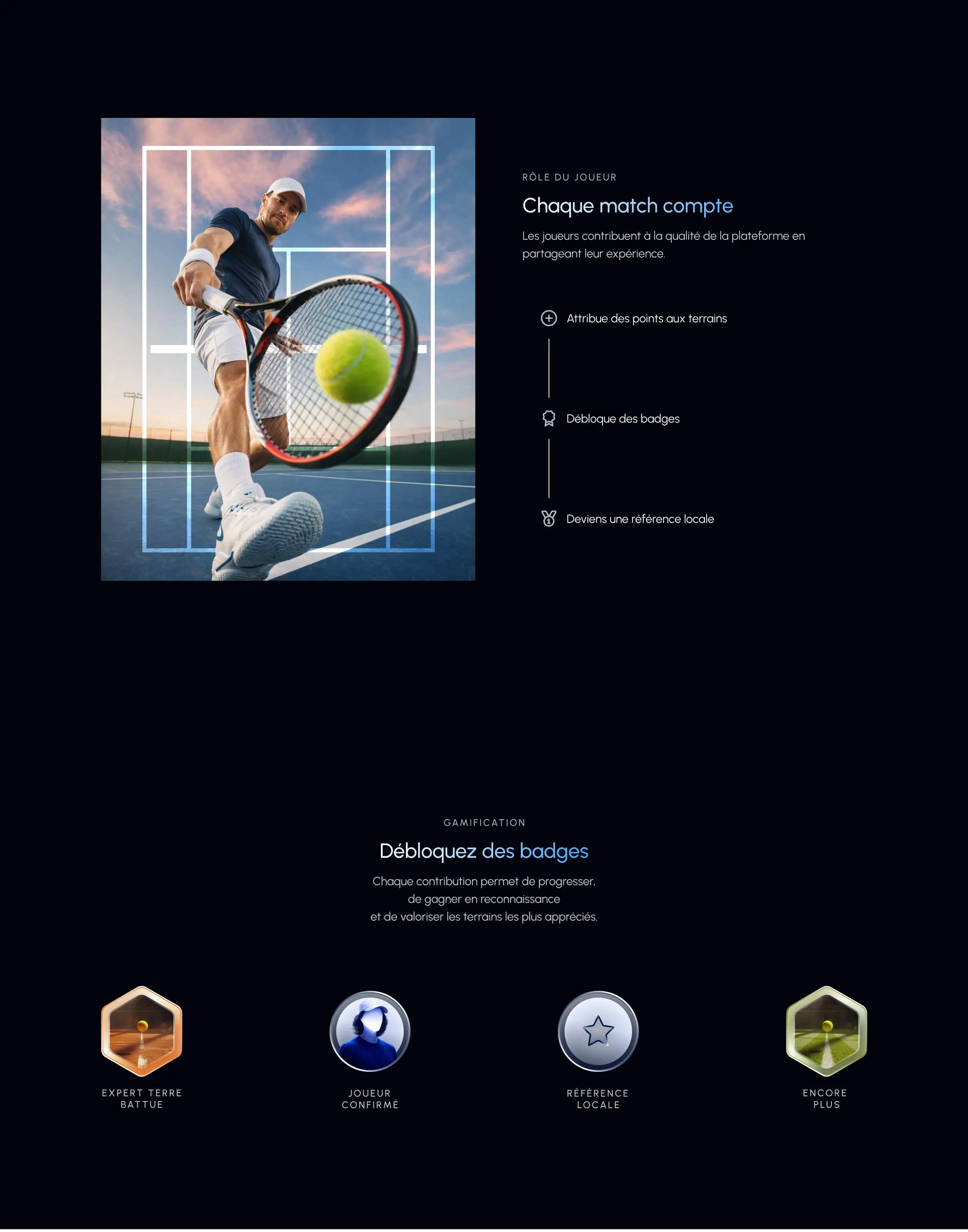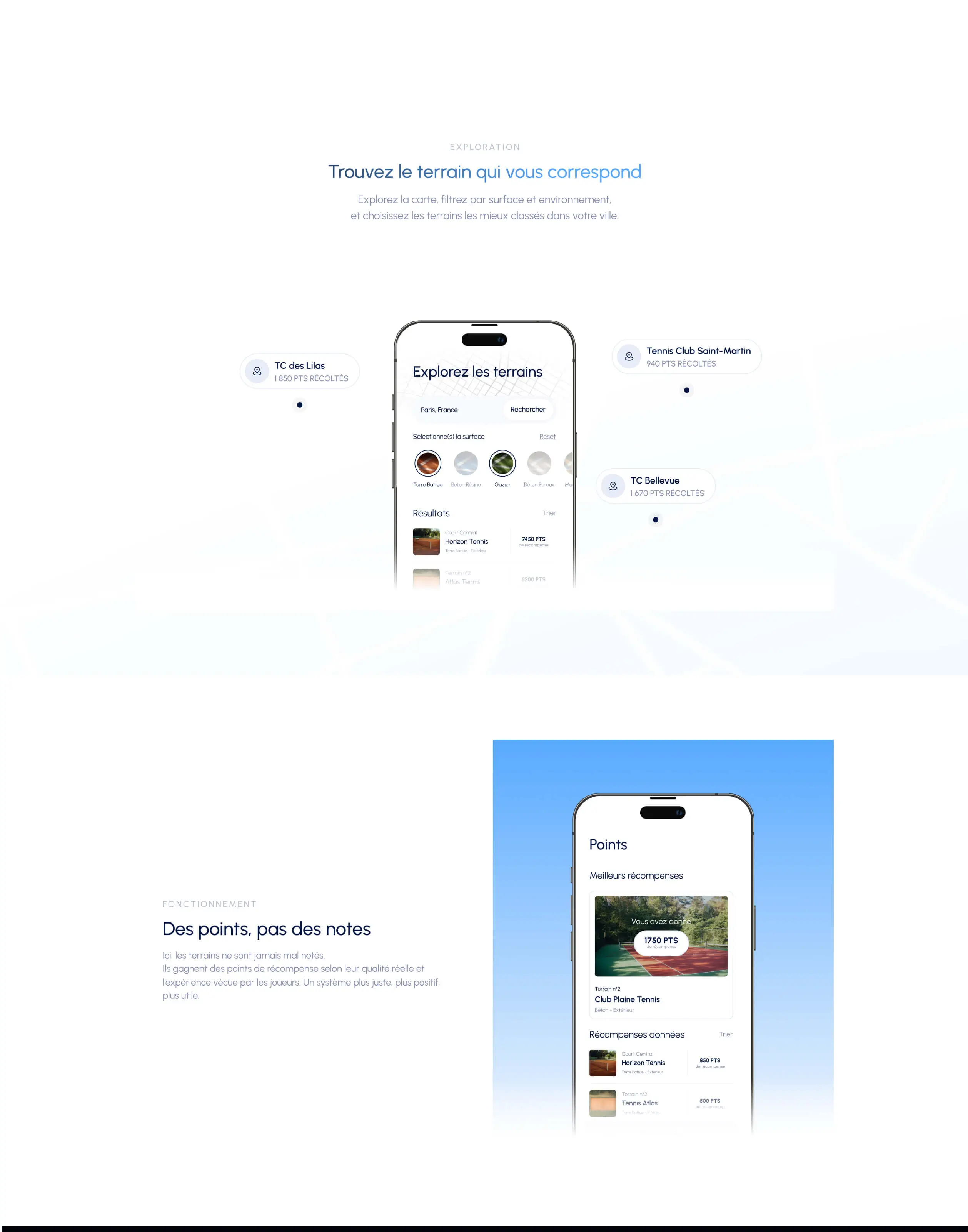 Conception et développement d'une application web pour découvrir et choisir des terrains de tennis. Projet personnel réalisé en 5 jours sur Framer pour les Framer Awards.
